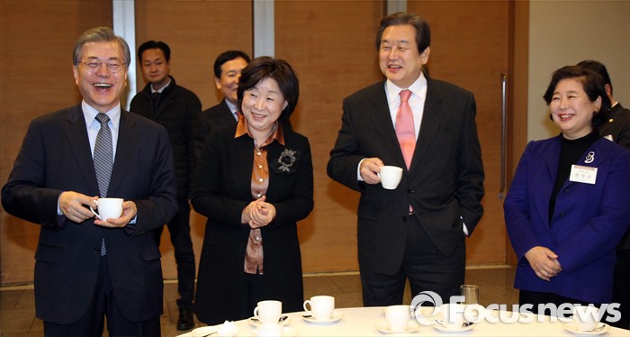 (서울=포커스뉴스) 중장기 어젠다 추진 전략회의가 26일 대한상공회의소 국제회의장에서 열린 가운데 회의전 3당 대표와 기업인들이 티타임을 갖고 있다.