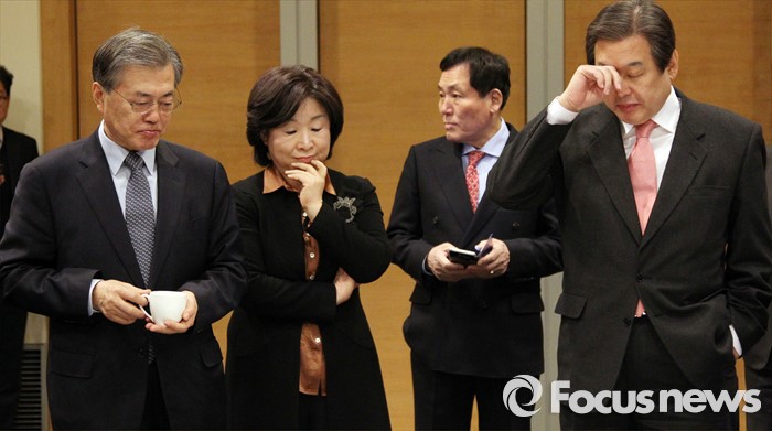 (서울=포커스뉴스) 중장기 어젠다 추진 전략회의가 26일 대한상공회의소 국제회의장에서 열린 가운데 회의전 3당 대표와 기업인들이 티타임을 갖고 있다.
