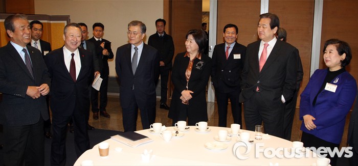 (서울=포커스뉴스) 중장기 어젠다 추진 전략회의가 26일 대한상공회의소 국제회의장에서 열린 가운데 회의전 3당 대표와 기업인들이 티타임을 갖고 있다.