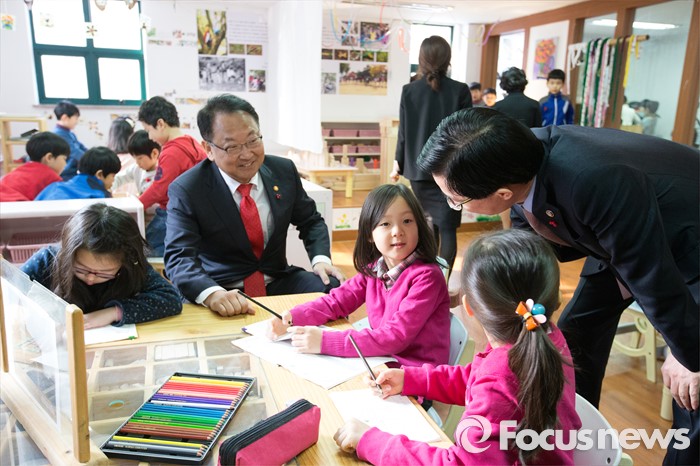 (서울=포커스뉴스) 누리과정 관련 현장을 방문한 유일호(왼쪽) 경제부총리 겸 기획재정부 장관과 방문규 보건복지부 차관이 26일 오전 서울 강서구 보라유치원에 방문해 아이들이 노는 모습을 지켜보고 있다.