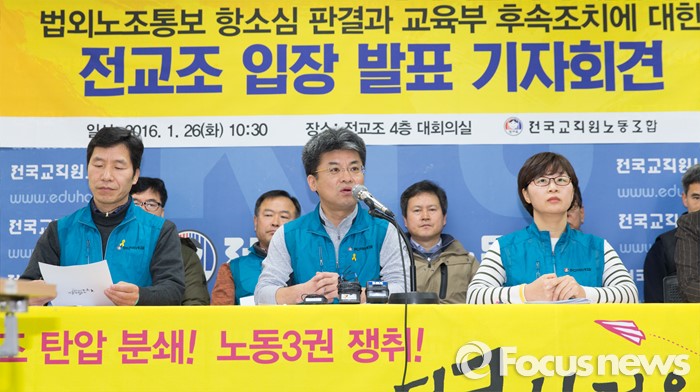 (서울=포커스뉴스) 26일 오전 서울 서대문구 전국교직원노동조합 대회의실에서 변성호(가운데) 전교조 위원장이 법외노조통보 항소심 판결과 교육부 후속조치에 대한 전교조 입장 발표 기자회견에 참석해 인사말을 하고 있다.