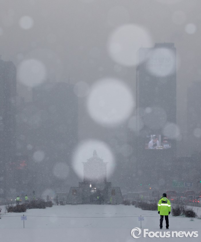 (서울=포커스뉴스) 서울을 비롯한 중부지역 곳곳에 눈이 내린 26일 오전 서울 광화문광장에 하얗게 눈이 쌓이고 있다.