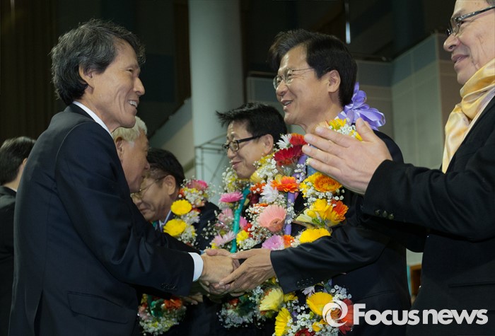 (전주=포커스뉴스) 국민의당과 통합 선언을 한 천정배 의원이 26일 오전 전주시 완산구 화산체육관에서 열린 전북도당 창당대회에서 한상진 공동창준위원장과 악수를 나누고 있다.