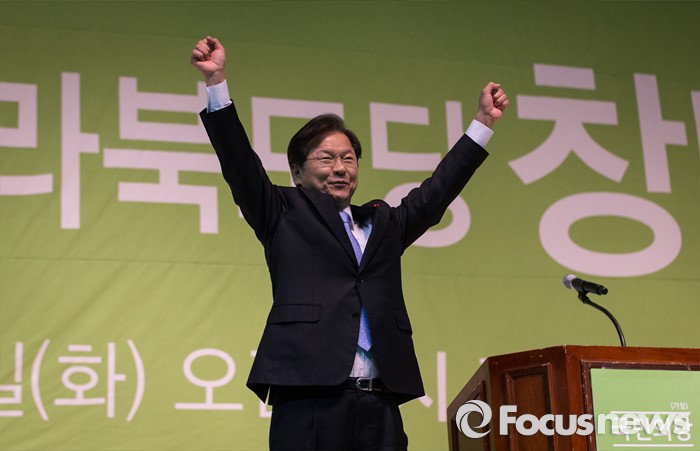 (전주=포커스뉴스) 국민의당과 통합 선언을 한 천정배 의원이 26일 오전 전주시 완산구 화산체육관에서 열린 전북도당 창당대회에 참석해 당원들의 환호에 답하고 있다.
