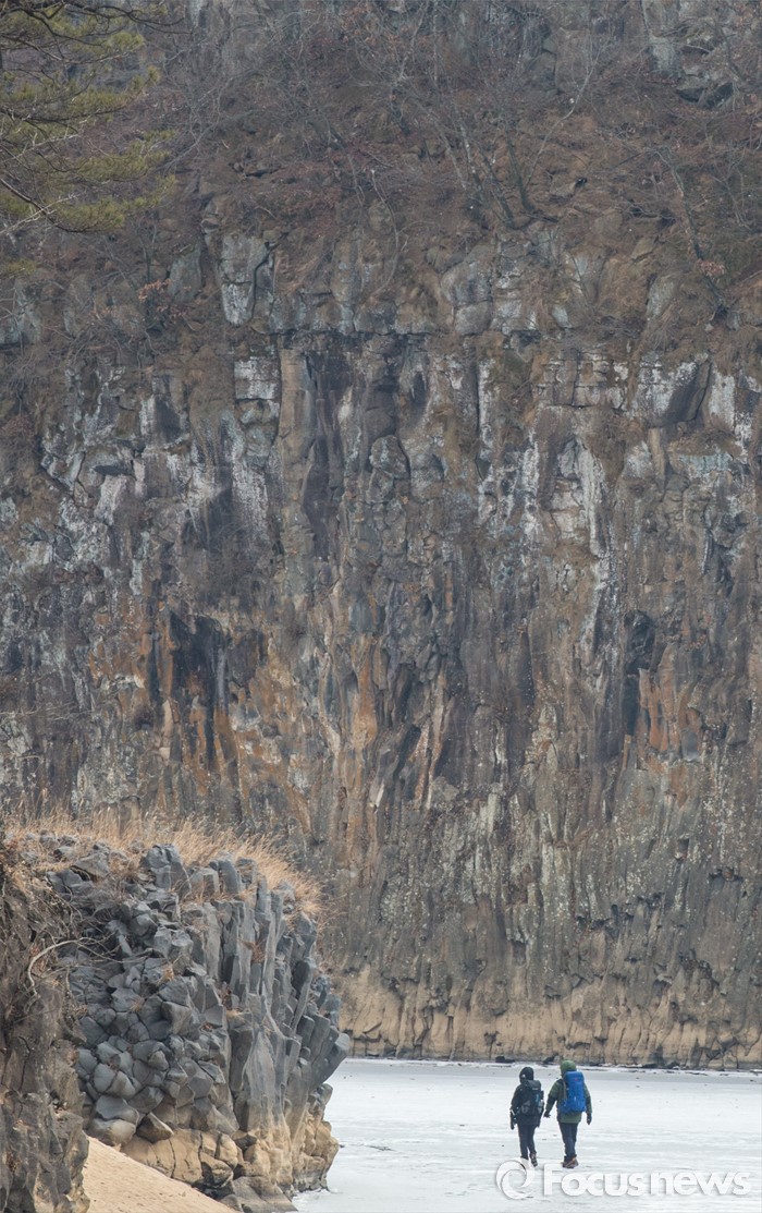 (철원=포커스뉴스) 26일 오전 강원 철원군 한탄강 일대에서 여행객들이 얼음트래킹을 즐기고 있다.