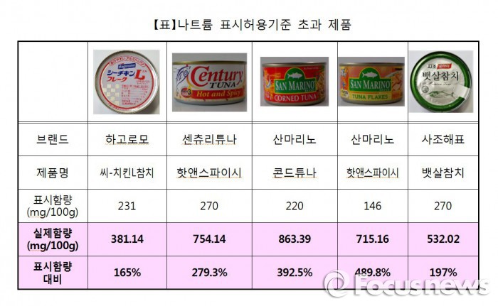 연맹의 시험결과에 따르면 수입 참치캔인 산마리노 핫앤스파이시의 경우 나트륨 함량이 715.16㎎/100g가 함유돼 표시된 함량(146㎎/100g)의 4.9배에 달했다.