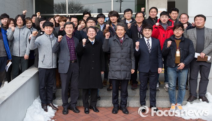 (전주=포커스뉴스) 국민의당 안철수 의원과 한상진 공동 창준위원장이 26일 오후 전주시 완산구 전주정보문화산업진흥원 IT벤처센터에서 열린 벤처기업 종사자들과 함께하는 도시락 간담회를 마치고 벤처기업 종사자들과 함께 기념사진을 찍고 있다.