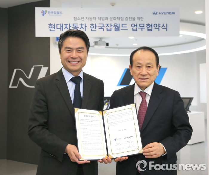 현대차의 고성능차인 'i20 WRC'가 전시된 모터스포츠 센터에서는 차량 정비 교육 영상을 시청하고 가상현실(VR) 시뮬레이터를 통한 레이싱 체험을 하게 된다.조원홍 현대차 부사장(왼쪽)과 장대익 한국잡월드 이사장이 업무협약식 후 기념사진을 찍고 있다. <사진제공=현대기아차> 2016.1.26. 김현이 인턴기자
