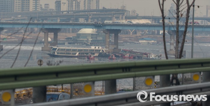 (서울=포커스뉴스) 26일 오후 서울 한강 영동대교 인근을 지나던 한강유람선이 침수, 구조대원들이 구조활동과 견인 작업을 하고 있다.
