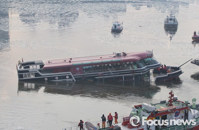 (서울=포커스뉴스) 26일 오후 서울 한강 영동대교 아래에서 한강유람선이 침수돼 구조대원들이 구조활동과 견인 작업을 하고 있다.