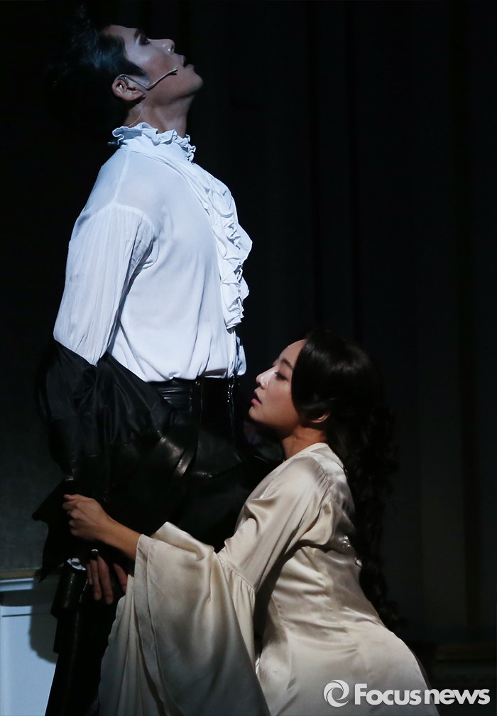 (서울=포커스뉴스) 26일 오후 서울 종로구 세종문화회관에서 열린 뮤지컬 '드라큘라' 프레스콜에 참석한 배우 박은석(왼쪽)과 임혜영이 하이라이트 공연을 선보이고 있다.