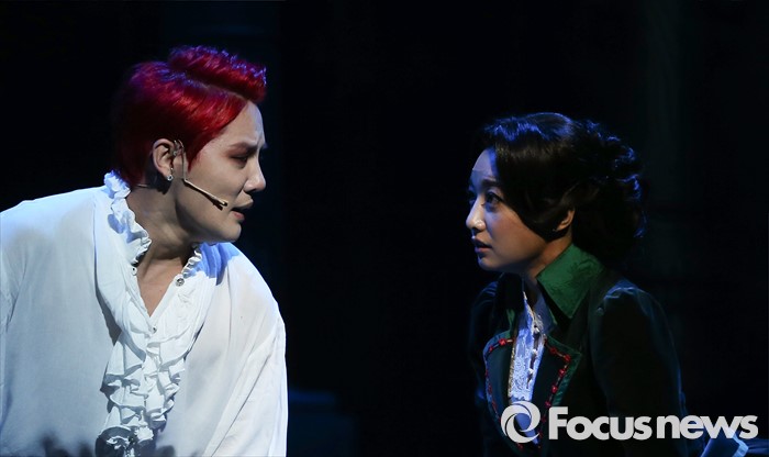 (서울=포커스뉴스) 26일 오후 서울 종로구 세종문화회관에서 열린 뮤지컬 '드라큘라' 프레스콜에 참석한 배우 김준수(왼쪽)와 임혜영이 하이라이트 공연을 선보이고 있다.