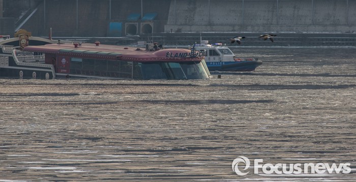 (서울=포커스뉴스) 26일 오후 서울 한강 영동대교 인근을 지나던 한강유람선이 침수, 구조대원들이 구조활동과 견인 작업을 하고 있다.