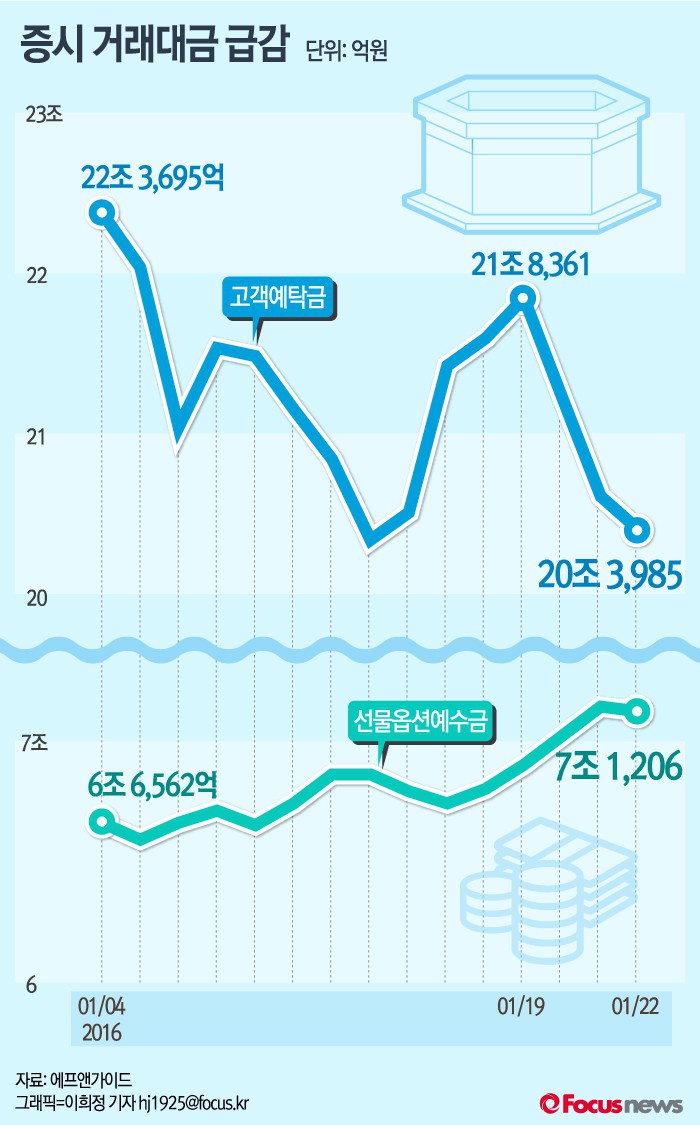 (서울=포커스뉴스) 26일 금융정보업체 에프앤가이드에 따르면 1월 22일 기준 고객예탁금은 20조 3,985억원으로 증시 거래대금이 급감하고 있다. 이에 반해 선물옵션예수금은 7조 1,206억원으로 늘었다.