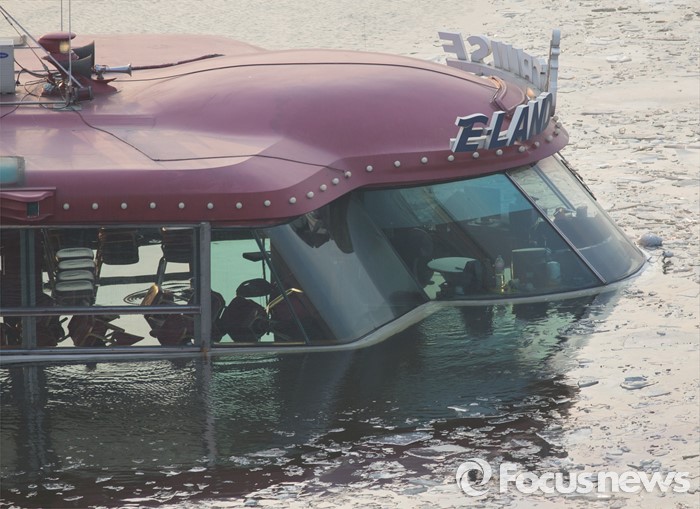 (서울=포커스뉴스) 26일 오후 서울 한강 영동대교 아래에서 소방대원들이 침수된 한강유람선 견인 작업을 하고 있다.