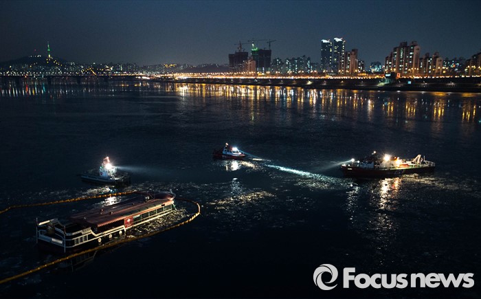 (서울=포커스뉴스) 26일 오후 서울 한강 영동대교 아래에서 한강유람선이 침수되어 관계 당국이 기름 유출을 막기 위해 방재작업을 하고 있다.