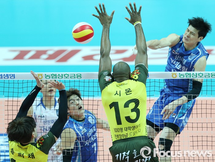 (안산=포커스뉴스) 26일 안산상록수체육관에서 열린 '2015-2016NH농협 V-리그' 남자부 OK저축은행-삼성화재 경기에서 삼성화재 이선규가 속공으로 공격하고 있다.