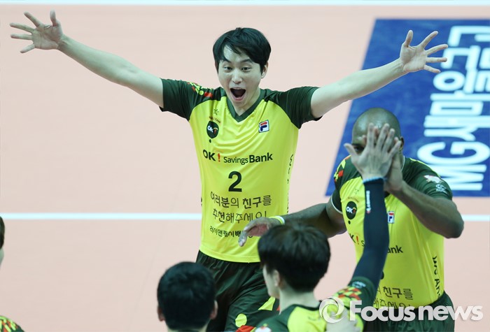(안산=포커스뉴스) 26일 안산상록수체육관에서 열린 '2015-2016NH농협 V-리그' 남자부 OK저축은행-삼성화재 경기에서 OK저축은행 세터 곽명우(2)가 시몬의 공격 성공에 환호하고 있다.
