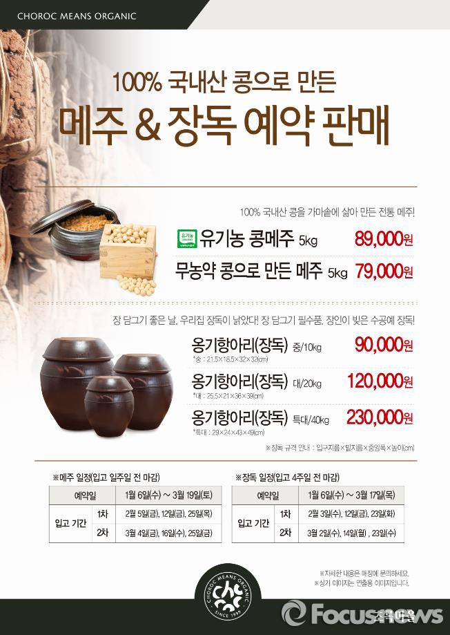 한상철 초록마을 상품기획본부 팀장은 “맛있는 장은 좋은 콩과 물에서 결정된다. 초록마을은 국내산 콩을 재배하기에 적합한 청정지역을 찾았고, 전통방식으로 발효시켰다”며 “앞으로도 초록마을은 고객님들에게 고품질의 상품을 제공하기 위해 각고의 노력을 다하겠다”고 밝혔다.초록마을 메주 예약판매 안내 포스터. <사진제공=초록마을>