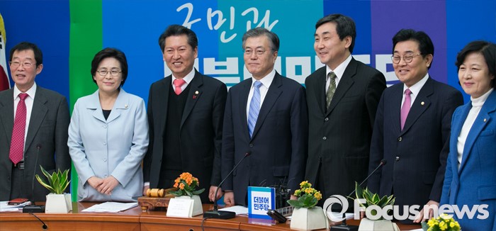 (서울=포커스뉴스) 문재인 더불어민주당 대표 등 지도부가 27일 오전 서울 여의도 국회에서 열린 최고위원회의에 앞서 취재진을 향해 포즈를 취하고 있다. 왼쪽부터 이용득, 유승희, 정청래 최고위원, 문 대표, 이종걸 원내대표, 전병헌, 추미애 최고위원.