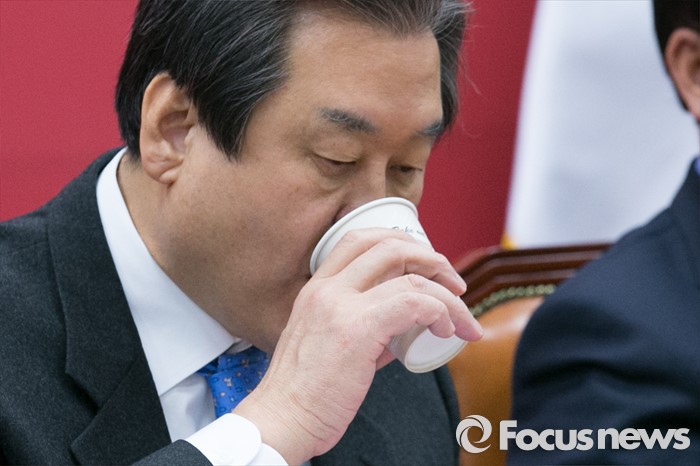 (서울=포커스뉴스) 김무성 새누리당 대표가 27일 오전 서울 여의도 국회에서 열린 최고중진연석회의에 참석해 물을 마시고 있다.