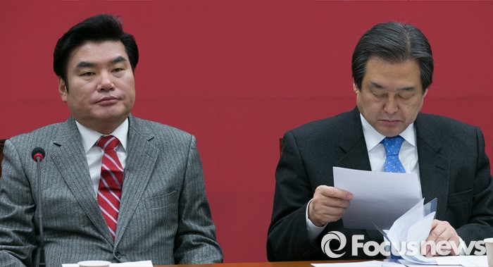 (서울=포커스뉴스) 김무성(오른쪽) 새누리당 대표와 원유철 원내대표가 27일 오전 서울 여의도 국회에서 열린 최고중진연석회의에 참석해, 각각 자리에 앉아 있다.