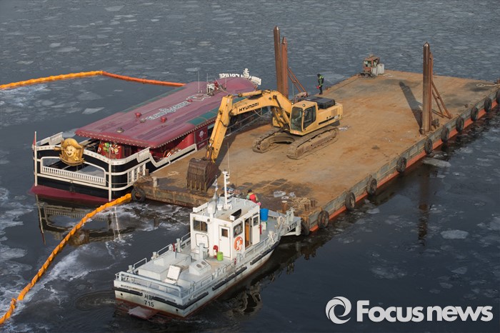 (서울=포커스뉴스) 27일 오전 서울 한강 영동대교 아래에서 침수된 한강유람선을 인양하기 위해 바지선이 정박해 있다.