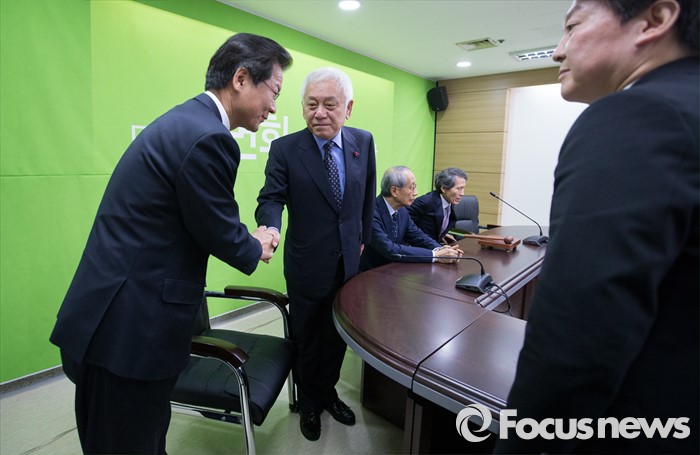 (서울=포커스뉴스) 국민의당과 통합한 천정배 의원이 27일 오전 서울 마포구 국민의당 당사에서 열린 기획조정회의에 참석해 김한길 의원과 인사를 나누고 있다.