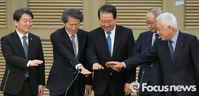 (서울=포커스뉴스) 27일 오전 서울 여의도 국회 의원회관에서 열린 국민의당-통합신당 통합발표 기자회견에 참석한 안철수(왼쪽부터) 국민의당 인재영입위원장, 한상진 공동창당준비위원장, 박주선 통합신당 창당준비위원장, 윤여준 국민의당 공동창당준비위원장, 김한길 상임부위원장이 취재진을 향해 포즈를 취하고 있다.