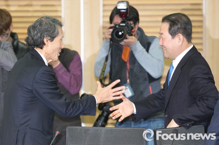 (서울=포커스뉴스) 27일 오전 서울 여의도 국회 의원회관에서 열린 국민의당-통합신당 통합발표 기자회견에 참석한 한상진(왼쪽) 국민의당 공동창당준비위원장과 박주선 통합신당 창당준비위원장이 인사하고 있다.