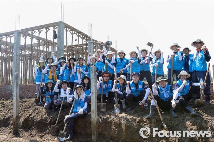 (서울=포커스뉴스) 명지대학교 2015년 동계 해외봉사활동 대원들이 20일 라오스 우돔싸이에서 초등학교 신축 봉사활동 후 기념촬영을 하고 있다. 명지대학교 자원봉사팀은 28일 까지 인도차이나 지역 타 국가에 비해 교육환경이 열악한 라오스에 교사를 신축하고 교육프로그램 등을 지원했다. <사진제공=명지대학교>