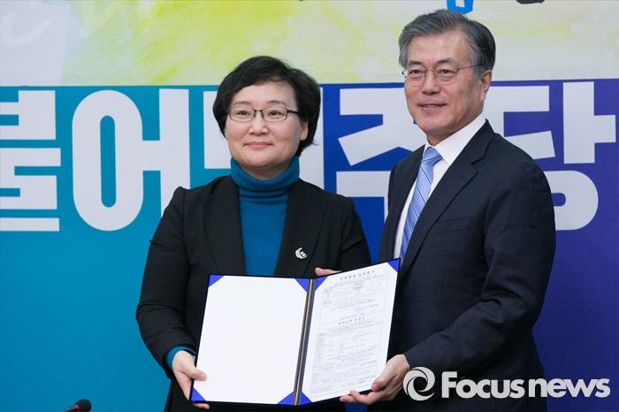(서울=포커스뉴스) 문미옥(왼쪽) 한국여성과학기술인지원센터 기획정책실장이 27일 오전 서울 여의도 국회 더불어민주당 대표회의실에서 입당 기자회견을 마치고 문재인 대표와 기념사진을 찍고 있다
