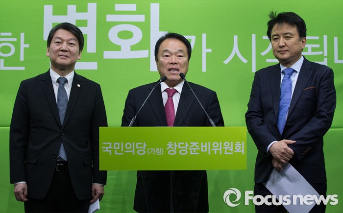 (서울=포커스뉴스) 이성수 전 대구시 의회 의장이 27일 오전 서울 마포구 국민의당 당사 기자회견장에서 국민의당 합류 의사를 밝히고 있다. (오른쪽부터) 안철수 의원, 이성수 전 대구시 의회 의장, 김영환 전략위원장