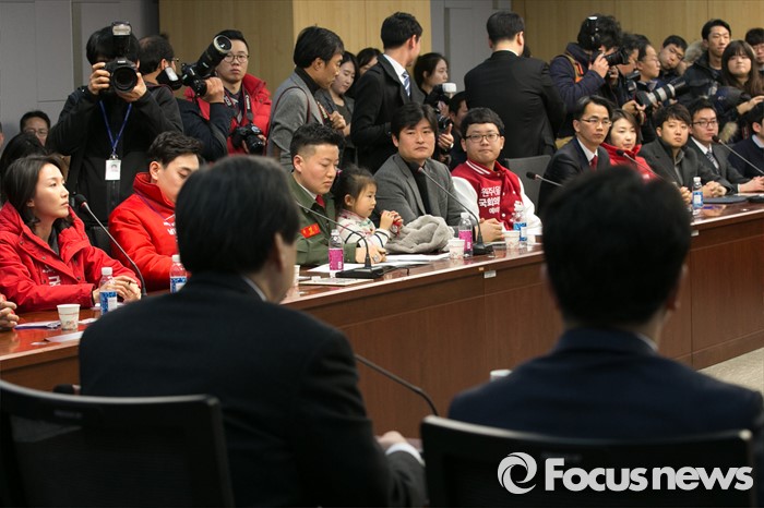 (서울=포커스뉴스) 김무성(앞줄 왼쪽 뒷모습) 새누리당 대표가 27일 오후 서울 여의도 국회 의원회관에서 열린 청년 공천 설명회에 참석해, 인사말을 하는 동안 예비후보들이 경청하고 있다.
