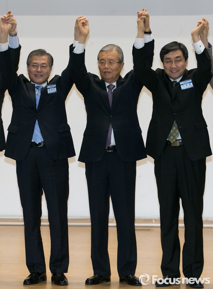 (서울=포커스뉴스) 27일 오후 서울 여의도 국회에서 열린 더불어민주당 중앙위원회의에 참석한 문재인(왼쪽부터) 대표, 김종인 선거대책위원장 겸 비대위원장, 이종걸 원내대표가 취재진을 향해 포즈를 취하고 있다.