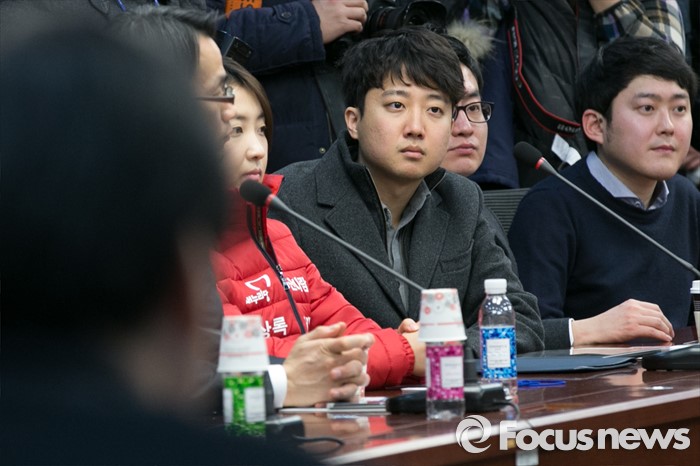 (서울=포커스뉴스) 김무성(앞줄 뒷모습) 새누리당 대표가 27일 오후 서울 여의도 국회 의원회관에서 열린 청년 공천 설명회에 참석해, 인사말을 하는 동안 이준석(오른쪽 두번째) 예비후보가 경청하고 있다.