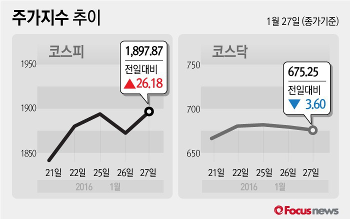 (서울=포커스뉴스) 27일 코스피지수는 전날 보다 1.40%(26.18포인트) 오른 1897.87에 장을 마쳤다. 코스닥지수는 전일 대비 0.53%(3.60포인트) 내린 675.25에 마감했다.