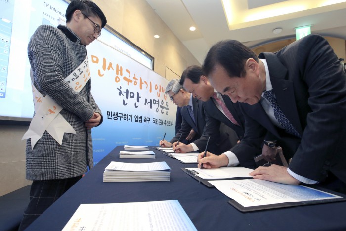 민생구하기 입법촉구 범국민 서명운동은 지난 13일부터 시작됐다. 기업활력제고특별법, 서비스산업발전기본법, 노동개혁법(근로기준법 등) 등 경제활성화 법안의 조속한 처리를 촉구하는 캠페인이다. 대한상의 등 주요 경제단체에 서명부스가 설치돼 있으며, 공식 홈페이지(www.korcham.net)를 통한 온라인 참여도 할 수 있다.1월22일 이인원 롯데정책본부 부회장과 롯데그룹 임직원들이 서울 중구 소공동 롯데백화점 1층에 설치된 부스에서 민생구하기 입법 천만 서명운동에 참여하고 있다.<사진제공=롯데>