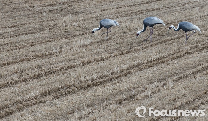 (철원=포커스뉴스) 겨울 진객 재두루미가 26일 강원 철원군 빈 논에서 떨어진 곡식을 쪼고 있다.