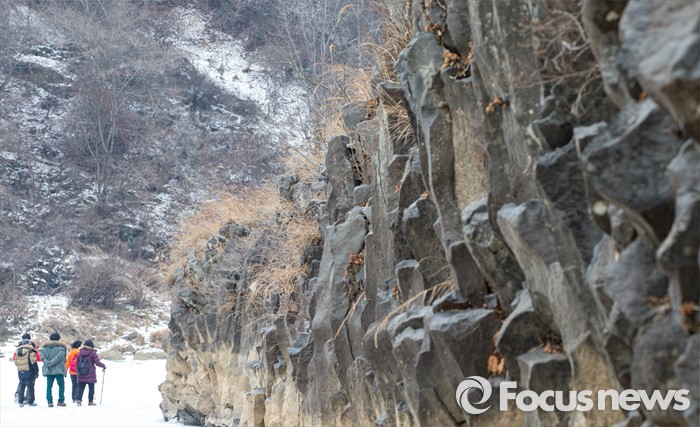 (철원=포커스뉴스) 26일 강원 철원군 현무암 협곡 주상절리 아래로 얼어붙은 한탄강 위에서 여행객이 트래킹을 즐기고 있다.