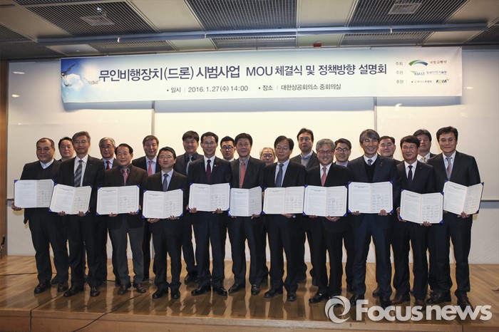 (서울=포커스뉴스) 최정호 2차관이 27일 오후 서울 중구 대한상공회의소에서 열린 무인비행장치(드론) 시범사업 MOU 체결식에 참석해 협약서를 들고 기념촬영하고 있다. <사진제공=국토교통부>