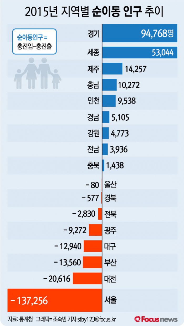 (서울=포커스뉴스) 27일 통계청 자료에 따르면 지난해 순이동 인구(총 전입자 수에서 총 전출자 수를 뺀 인구)는 9만4,768명으로 경기가 제일 많았다.