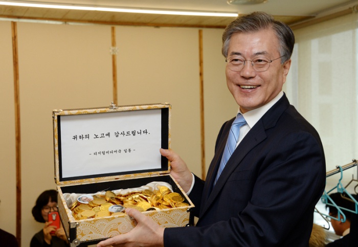 (서울=포커스뉴스) 문재인 더불어민주당 대표가 27일 서울 여의도 한 음식점에서 열린 당직자와의 오찬 간담회에 참석해 당직자들로부터 금화 모양 초콜릿 퇴직금을 선물받고 있다. <사진제공=더불어민주당>
