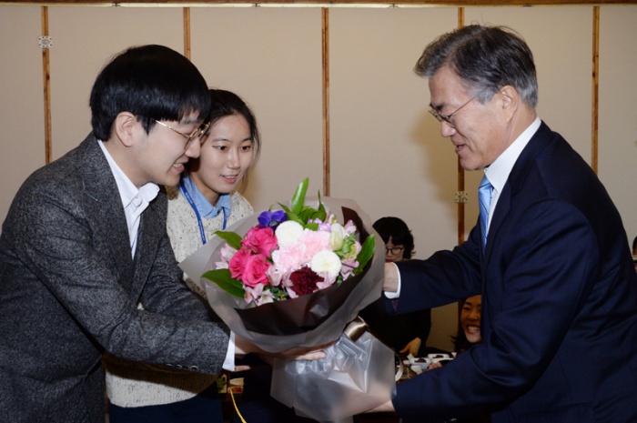 (서울=포커스뉴스) 문재인 더불어민주당 대표가 27일 서울 여의도 한 음식점에서 열린 당직자와의 오찬 간담회에 참석해 당직자들로부터 꽃다발을 전달받고 있다. <사진제공=더불어민주당>