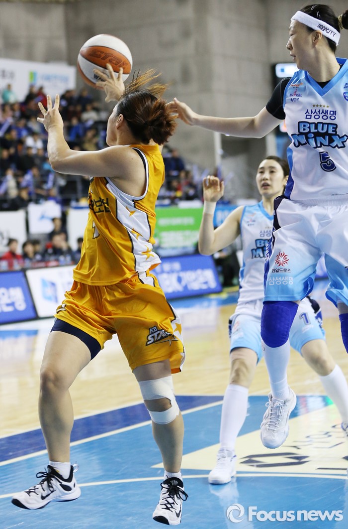 (용인=포커스뉴스) 27일 용인실내체육관에서 열린 2015-2016 여자프로농구 삼성생명-KB스타즈 경기에서 KB스타즈 심성영이 돌파를 시도하다 뒤로 패스하고 있다.