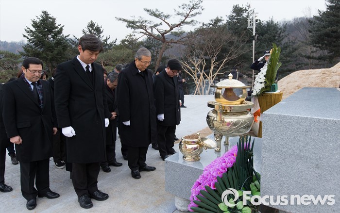 (서울=포커스뉴스) 28일 오전 서울 동작구 국립서울현충원에서 김종인 선거대책위원장 겸 비대위원장이 김영삼 전 대통령 묘역 참배를 하고 있다.