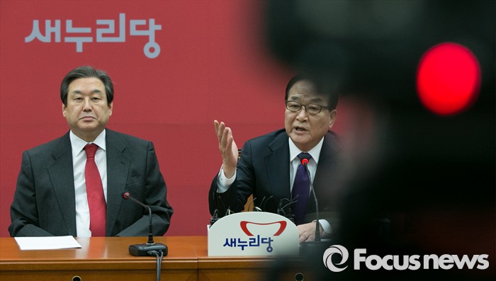 (서울=포커스뉴스) 서청원(오른쪽) 새누리당 최고위원이 28일 오전 서울 여의도 국회에서 열린 최고위원회의에 참석해 발언하는 동안, 김무성 대표가 경청하고 있다. 이 자리에서 서 최고위원은 김 대표를 향해 “김무성 대표가 권력자 발언을 해서 왜 이런 이야기를 해서 분란을 일으키느냐”고 정면 비판했다.