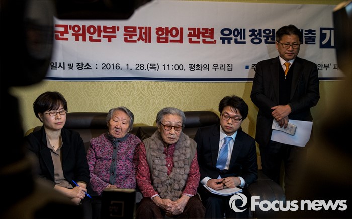 (서울=포커스뉴스) 28일 오전 서울 마포구 평화의 우리집에서 열린 일본군'위안부' 문제합의 관련, 유엔 청원서 제출 기자회견에 참석한 김복동(가운데) 할머니가 취재진에게 인사말을 하고 있다.