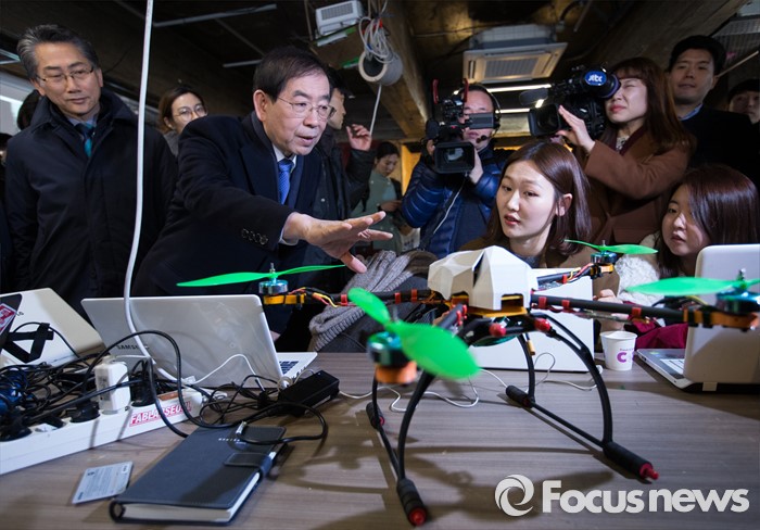 (서울=포커스뉴스) 박원순 서울시장이 28일 오전 서울 종로구 세운상가 디지털 기술 기반 제작 및 교육 공간을 찾아 작업자들이 만든 드론을 살펴보고 있다.