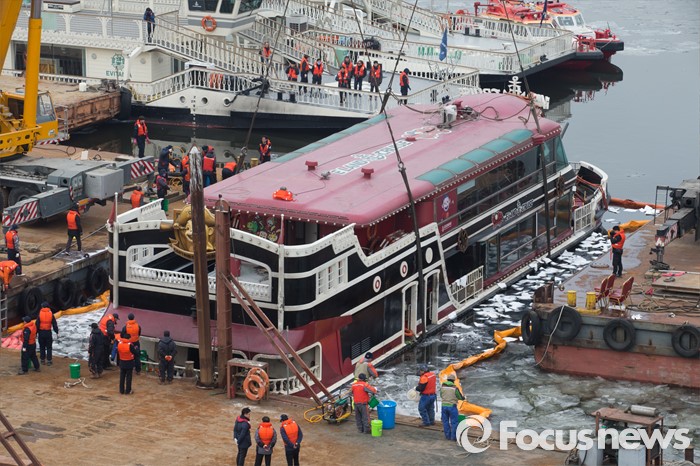 (서울=포커스뉴스) 28일 오후 서울 한강 영동대교 인근에서 예인업체 관계자들이 침수된 이랜드 크루즈 유람선 인양 작업을 하고 있다.